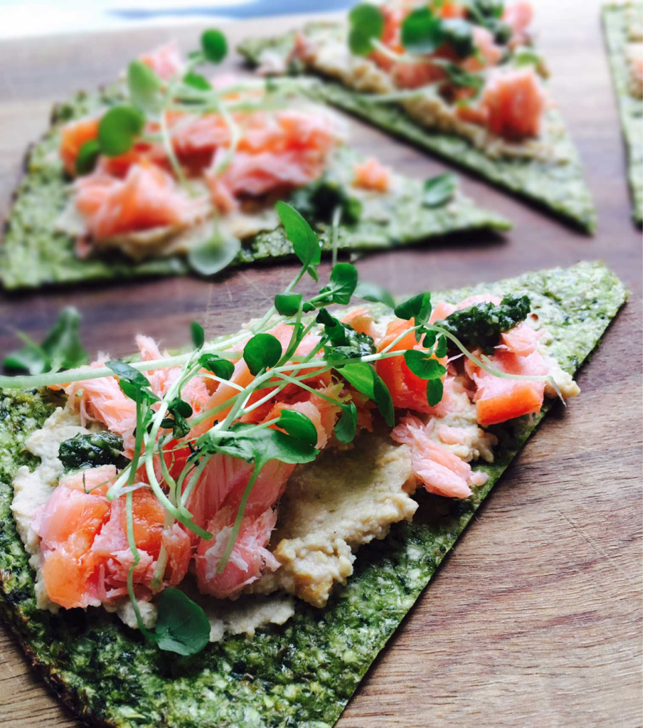 I stedet for ost og tomatsovs har jeg toppet denne med humus og laks. Humus er jo lavet af kikærter, og hvorvidt det er “LCHF” eller “low carb” har jeg aldrig helt vidst, men jeg har hældt til, at det var det nok strengt taget ikke. Forleden fandt jeg den første LCHF-bog, jeg købte engang for 100 år siden. En lille paperback af Annika Dahlqvist (LCHF’s almægtige svenske moder), og hun havde sørme både gulerødder og bælgfrugter på plus-listen. Well, jeg vil lade det være op til den enkelte at afgøre, om bælgfrugter er inde eller ude. Bare jeg får lov at spise min humus.